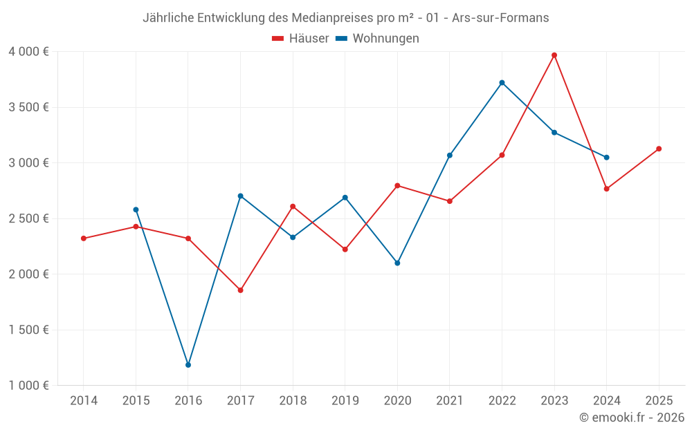 Der Durchschnittspreis auf den 14 Hausgeschäften der letzten 24 Monate in der Gemeinde Ars-sur-Formans betrug 2 947 € pro Quadratmeter für einen mittleren Immobilienwert von 309 820 €. Über diesen Zeitraum hinweg lagen 60% der Transaktionen zwischen 2 292 und 3 252 € pro Quadratmeter (vom 2. bis zum 8. Dezil).