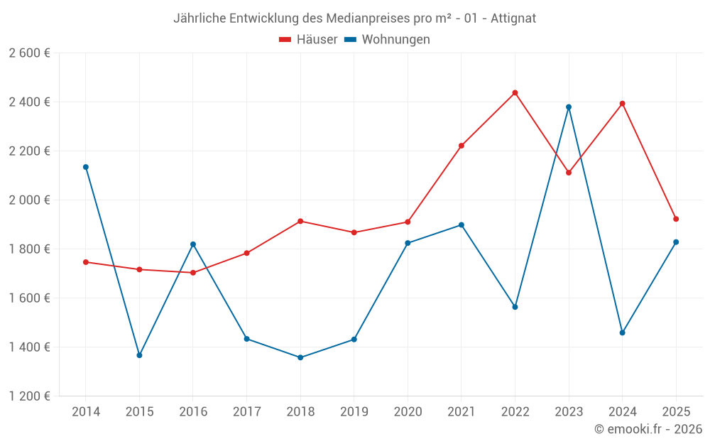 Der Durchschnittspreis auf den 14 Wohnungstransaktionen der letzten 24 Monate in der Gemeinde Attignat betrug 2 095 € pro Quadratmeter für einen mittleren Immobilienwert von 132 500 €. Über diesen Zeitraum hinweg lagen 60% der Transaktionen zwischen 1 261 und 2 640 € pro Quadratmeter (vom 2. bis zum 8. Dezil).