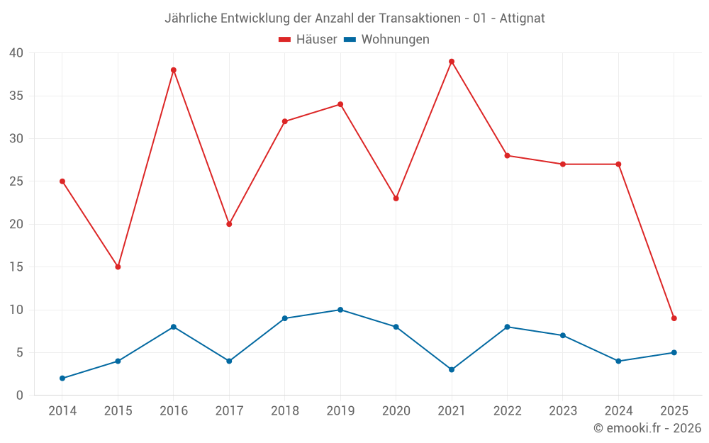 Der Durchschnittspreis auf den 21 Hausgeschäften der letzten 12 Monate in der Gemeinde Attignat betrug 1 964 € pro Quadratmeter für einen mittleren Immobilienwert von 235 300 €. Über diesen Zeitraum hinweg lagen 60% der Transaktionen zwischen 1 452 und 2 619 € pro Quadratmeter (vom 2. bis zum 8. Dezil).