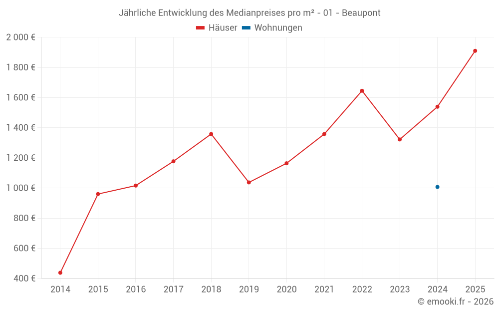 Der Durchschnittspreis auf den 18 Hausgeschäften der letzten 24 Monate in der Gemeinde Beaupont betrug 1 534 € pro Quadratmeter für einen mittleren Immobilienwert von 150 000 €. Über diesen Zeitraum hinweg lagen 60% der Transaktionen zwischen 1 297 und 1 773 € pro Quadratmeter (vom 2. bis zum 8. Dezil).