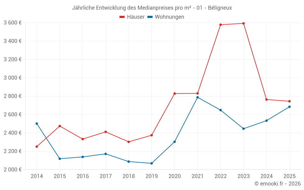 Der Durchschnittspreis auf den 26 Hausgeschäften der letzten 24 Monate in der Gemeinde Béligneux betrug 2 699 € pro Quadratmeter für einen mittleren Immobilienwert von 306 225 €. Über diesen Zeitraum hinweg lagen 60% der Transaktionen zwischen 1 950 und 3 793 € pro Quadratmeter (vom 2. bis zum 8. Dezil).