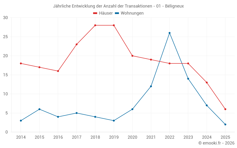 Der Durchschnittspreis auf den 16 Wohnungstransaktionen der letzten 24 Monate in der Gemeinde Béligneux betrug 2 506 € pro Quadratmeter für einen mittleren Immobilienwert von 188 500 €. Über diesen Zeitraum hinweg lagen 60% der Transaktionen zwischen 2 030 und 2 895 € pro Quadratmeter (vom 2. bis zum 8. Dezil).