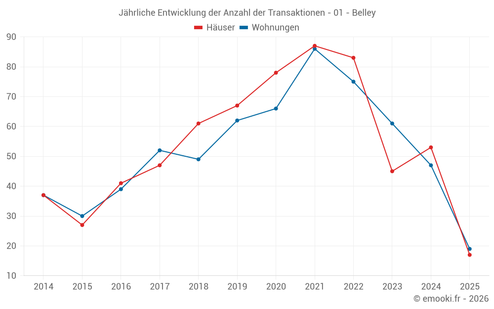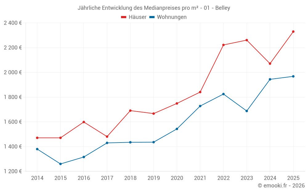 Der Durchschnittspreis auf den 43 Hausgeschäften der letzten 12 Monate in der Gemeinde Belley betrug 2 321 € pro Quadratmeter für einen mittleren Immobilienwert von 220 000 €. Über diesen Zeitraum hinweg lagen 60% der Transaktionen zwischen 1 403 und 2 548 € pro Quadratmeter (vom 2. bis zum 8. Dezil).