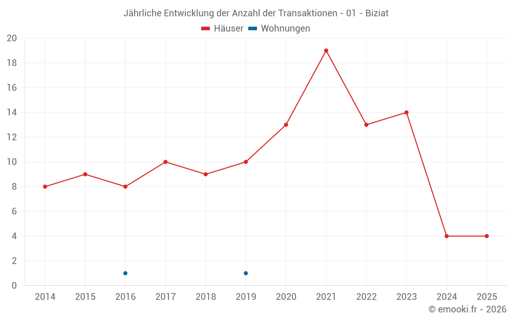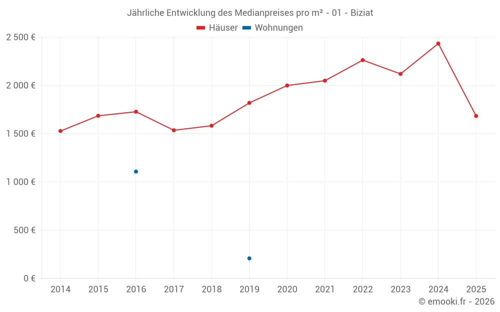 Der Durchschnittspreis auf den 14 Hausgeschäften der letzten 24 Monate in der Gemeinde Biziat betrug 2 192 € pro Quadratmeter für einen mittleren Immobilienwert von 250 000 €. Über diesen Zeitraum hinweg lagen 60% der Transaktionen zwischen 1 328 und 2 895 € pro Quadratmeter (vom 2. bis zum 8. Dezil).