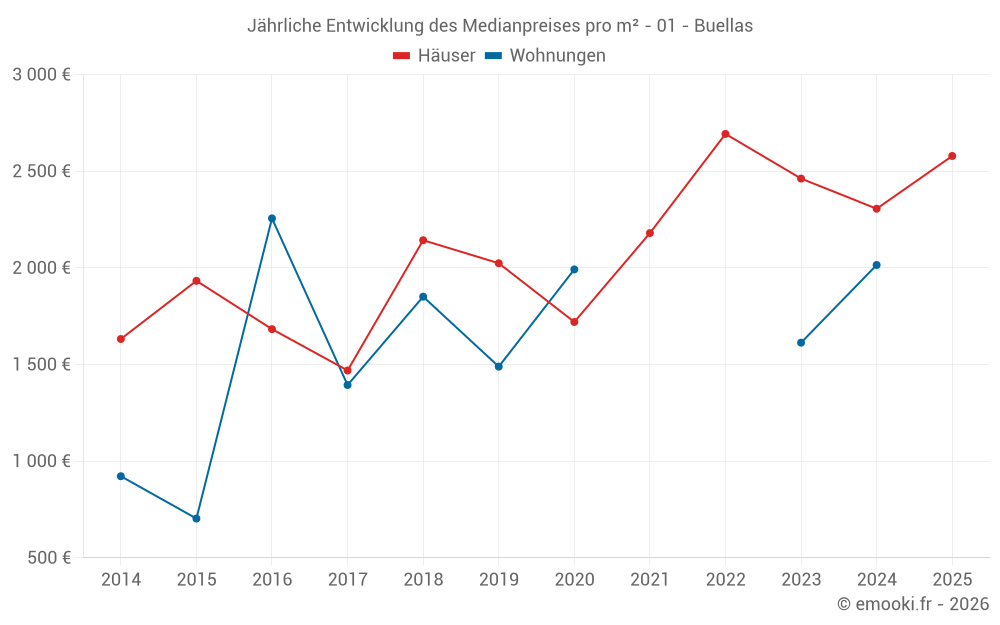 Der Durchschnittspreis auf den 21 Hausgeschäften der letzten 12 Monate in der Gemeinde Buellas betrug 2 579 € pro Quadratmeter für einen mittleren Immobilienwert von 292 000 €. Über diesen Zeitraum hinweg lagen 60% der Transaktionen zwischen 2 099 und 2 857 € pro Quadratmeter (vom 2. bis zum 8. Dezil).