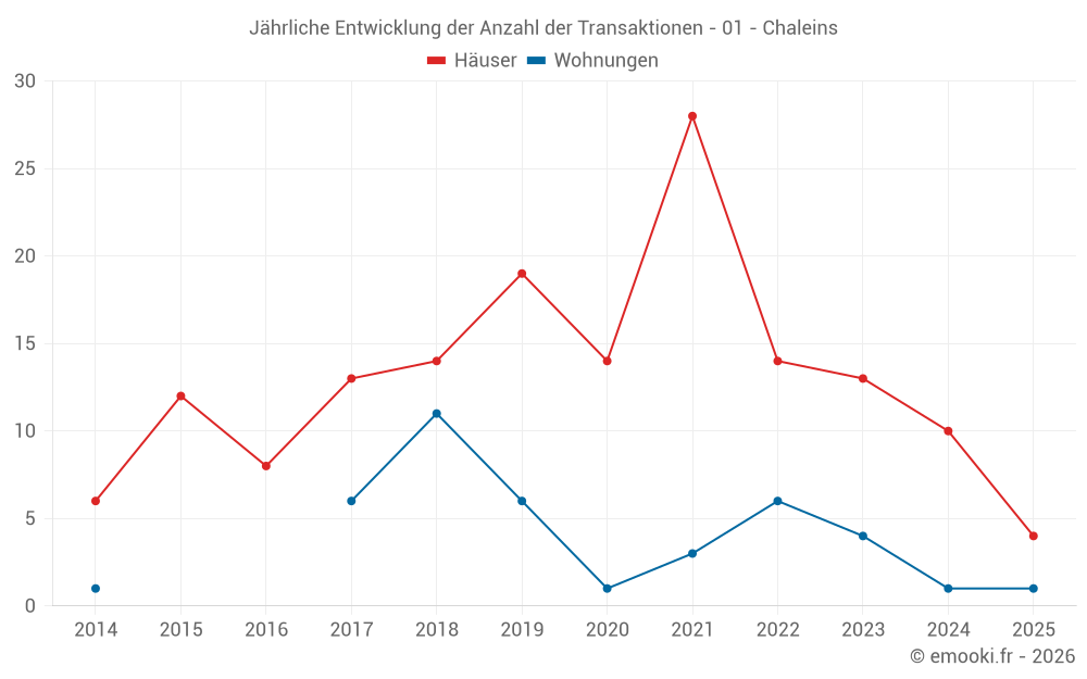 Der Durchschnittspreis auf den 20 Hausgeschäften der letzten 24 Monate in der Gemeinde Chaleins betrug 2 784 € pro Quadratmeter für einen mittleren Immobilienwert von 291 500 €. Über diesen Zeitraum hinweg lagen 60% der Transaktionen zwischen 1 913 und 3 319 € pro Quadratmeter (vom 2. bis zum 8. Dezil).