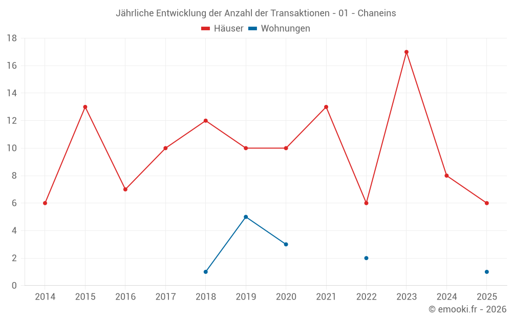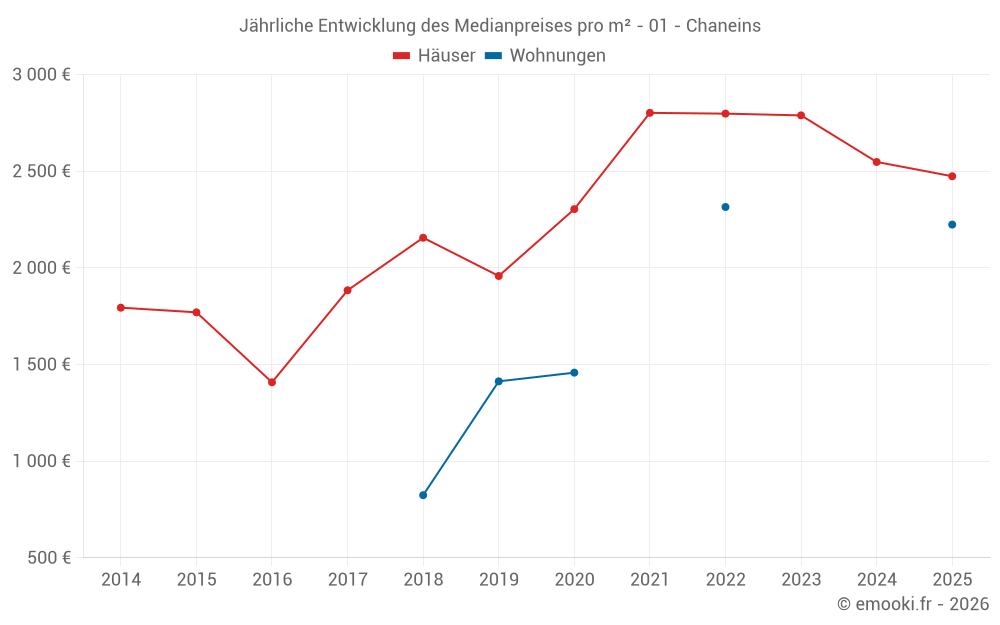 Der Durchschnittspreis auf den 26 Hausgeschäften der letzten 24 Monate in der Gemeinde Chaneins betrug 2 548 € pro Quadratmeter für einen mittleren Immobilienwert von 323 700 €. Über diesen Zeitraum hinweg lagen 60% der Transaktionen zwischen 2 056 und 2 968 € pro Quadratmeter (vom 2. bis zum 8. Dezil).