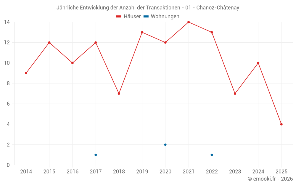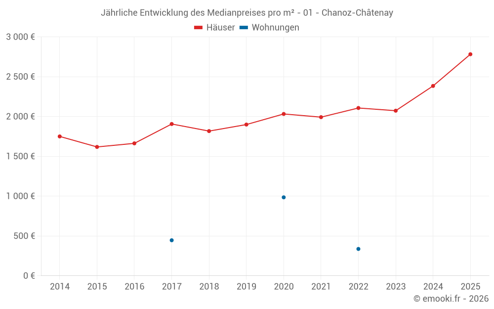 Der Durchschnittspreis auf den 18 Hausgeschäften der letzten 24 Monate in der Gemeinde Chanoz-Châtenay betrug 2 390 € pro Quadratmeter für einen mittleren Immobilienwert von 265 000 €. Über diesen Zeitraum hinweg lagen 60% der Transaktionen zwischen 2 085 und 2 759 € pro Quadratmeter (vom 2. bis zum 8. Dezil).