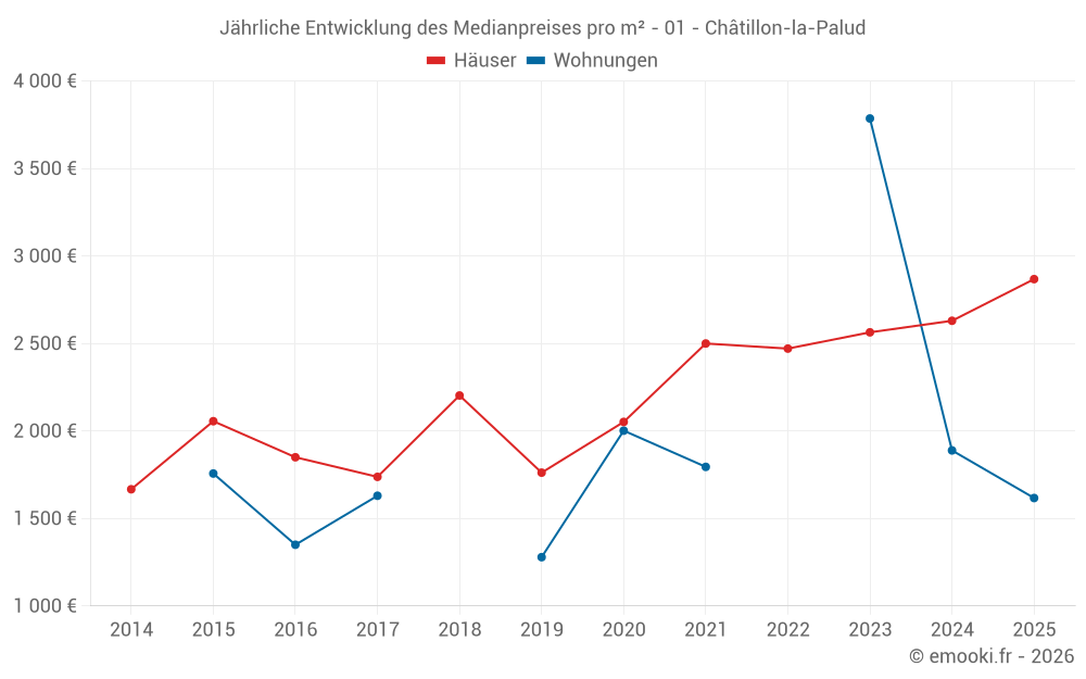 Der Durchschnittspreis auf den 31 Hausgeschäften der letzten 24 Monate in der Gemeinde Châtillon-la-Palud betrug 2 697 € pro Quadratmeter für einen mittleren Immobilienwert von 225 000 €. Über diesen Zeitraum hinweg lagen 60% der Transaktionen zwischen 1 964 und 3 084 € pro Quadratmeter (vom 2. bis zum 8. Dezil).