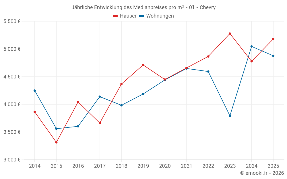 Der Durchschnittspreis auf den 17 Wohnungstransaktionen der letzten 12 Monate in der Gemeinde Chevry betrug 4 836 € pro Quadratmeter für einen mittleren Immobilienwert von 310 000 €. Über diesen Zeitraum hinweg lagen 60% der Transaktionen zwischen 4 003 und 5 708 € pro Quadratmeter (vom 2. bis zum 8. Dezil).