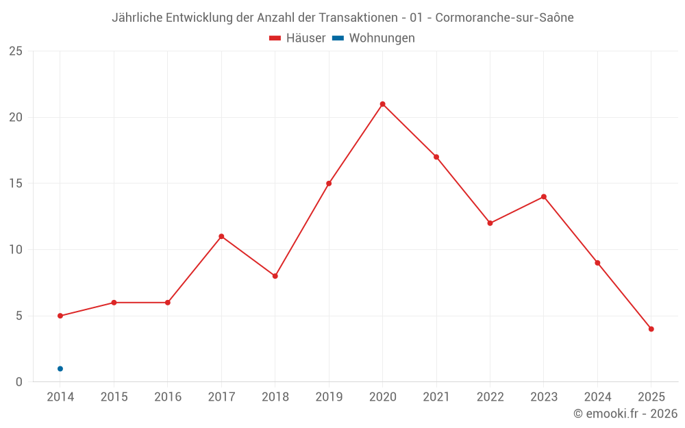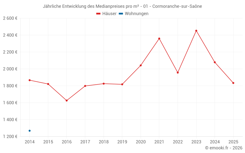 Der Durchschnittspreis auf den 22 Hausgeschäften der letzten 24 Monate in der Gemeinde Cormoranche-sur-Saône betrug 2 120 € pro Quadratmeter für einen mittleren Immobilienwert von 214 015 €. Über diesen Zeitraum hinweg lagen 60% der Transaktionen zwischen 1 793 und 2 625 € pro Quadratmeter (vom 2. bis zum 8. Dezil).