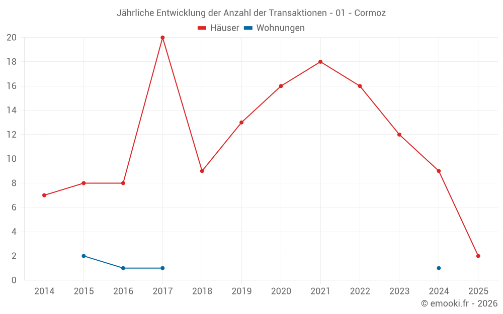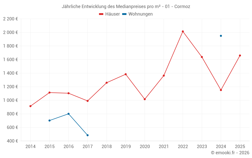 Der Durchschnittspreis auf den 14 Hausgeschäften der letzten 24 Monate in der Gemeinde Cormoz betrug 1 152 € pro Quadratmeter für einen mittleren Immobilienwert von 180 250 €. Über diesen Zeitraum hinweg lagen 60% der Transaktionen zwischen 815 und 2 625 € pro Quadratmeter (vom 2. bis zum 8. Dezil).