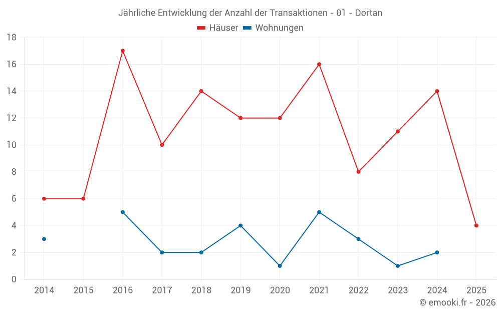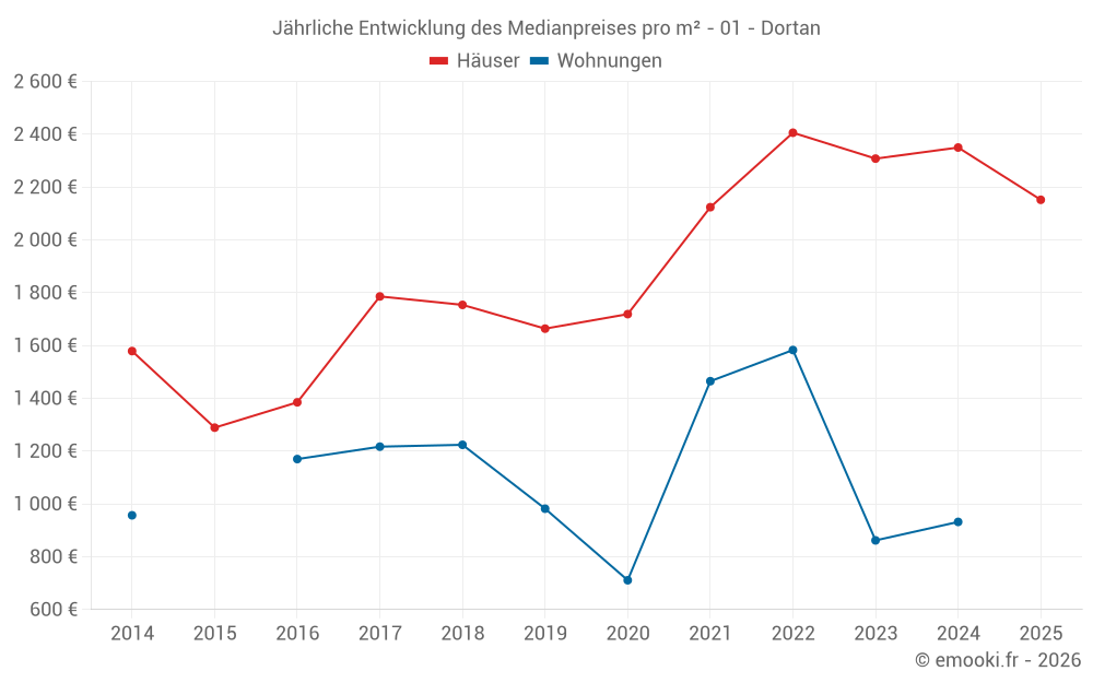 Der Durchschnittspreis auf den 24 Hausgeschäften der letzten 24 Monate in der Gemeinde Dortan betrug 2 338 € pro Quadratmeter für einen mittleren Immobilienwert von 217 500 €. Über diesen Zeitraum hinweg lagen 60% der Transaktionen zwischen 1 935 und 2 543 € pro Quadratmeter (vom 2. bis zum 8. Dezil).