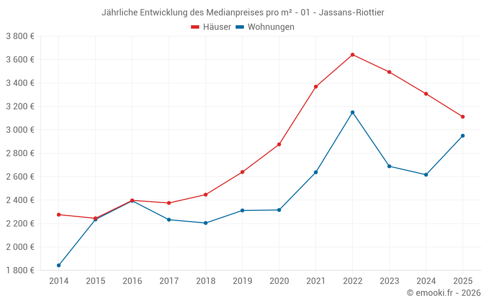 Der Durchschnittspreis auf den 19 Wohnungstransaktionen der letzten 12 Monate in der Gemeinde Jassans-Riottier betrug 2 829 € pro Quadratmeter für einen mittleren Immobilienwert von 177 000 €. Über diesen Zeitraum hinweg lagen 60% der Transaktionen zwischen 2 381 und 3 000 € pro Quadratmeter (vom 2. bis zum 8. Dezil).