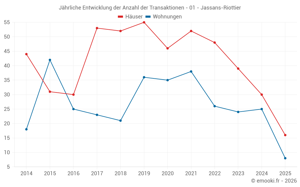 Der Durchschnittspreis auf den 32 Hausgeschäften der letzten 12 Monate in der Gemeinde Jassans-Riottier betrug 3 094 € pro Quadratmeter für einen mittleren Immobilienwert von 303 500 €. Über diesen Zeitraum hinweg lagen 60% der Transaktionen zwischen 2 797 und 3 632 € pro Quadratmeter (vom 2. bis zum 8. Dezil).