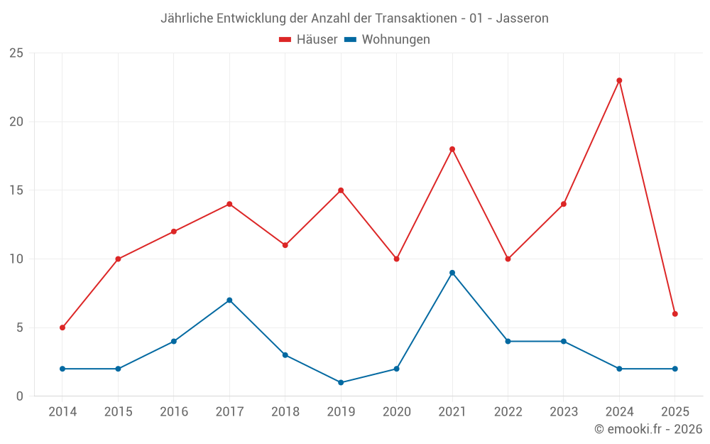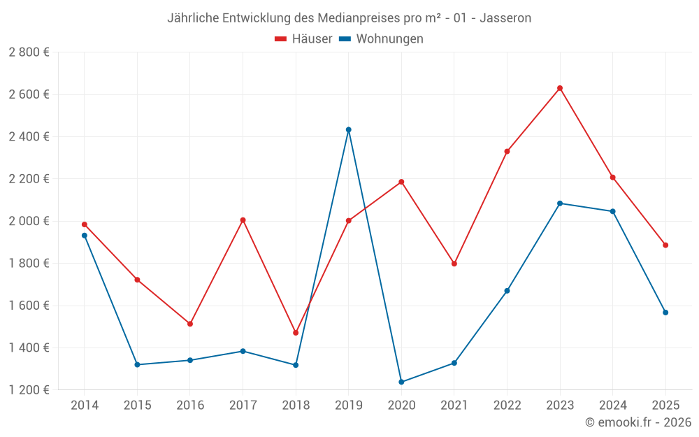 Der Durchschnittspreis auf den 19 Hausgeschäften der letzten 12 Monate in der Gemeinde Jasseron betrug 2 143 € pro Quadratmeter für einen mittleren Immobilienwert von 255 000 €. Über diesen Zeitraum hinweg lagen 60% der Transaktionen zwischen 1 791 und 2 622 € pro Quadratmeter (vom 2. bis zum 8. Dezil).