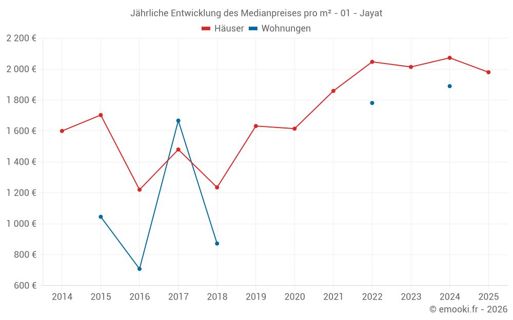 Der Durchschnittspreis auf den 22 Hausgeschäften der letzten 24 Monate in der Gemeinde Jayat betrug 2 083 € pro Quadratmeter für einen mittleren Immobilienwert von 201 750 €. Über diesen Zeitraum hinweg lagen 60% der Transaktionen zwischen 1 411 und 2 531 € pro Quadratmeter (vom 2. bis zum 8. Dezil).