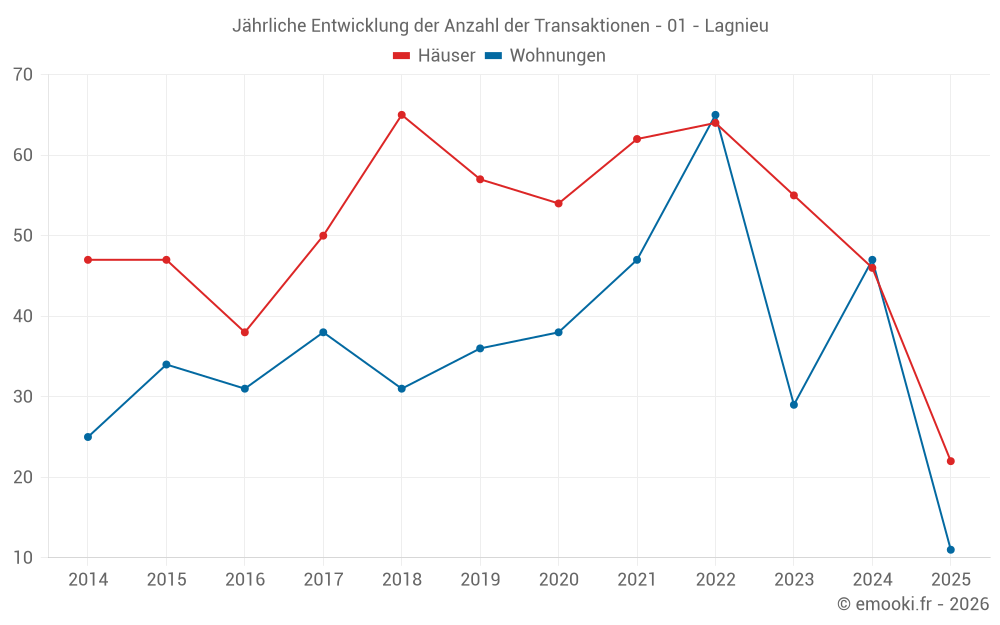 Der Durchschnittspreis auf den 22 Hausgeschäften der letzten 6 Monate in der Gemeinde Lagnieu betrug 2 518 € pro Quadratmeter für einen mittleren Immobilienwert von 228 875 €. Über diesen Zeitraum hinweg lagen 60% der Transaktionen zwischen 2 286 und 2 914 € pro Quadratmeter (vom 2. bis zum 8. Dezil).