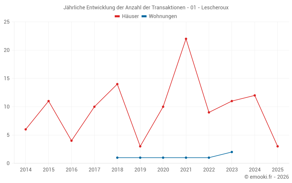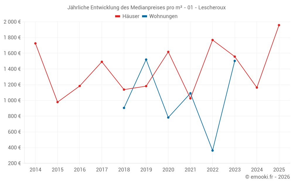 Der Durchschnittspreis auf den 18 Hausgeschäften der letzten 24 Monate in der Gemeinde Lescheroux betrug 1 716 € pro Quadratmeter für einen mittleren Immobilienwert von 154 000 €. Über diesen Zeitraum hinweg lagen 60% der Transaktionen zwischen 602 und 2 044 € pro Quadratmeter (vom 2. bis zum 8. Dezil).