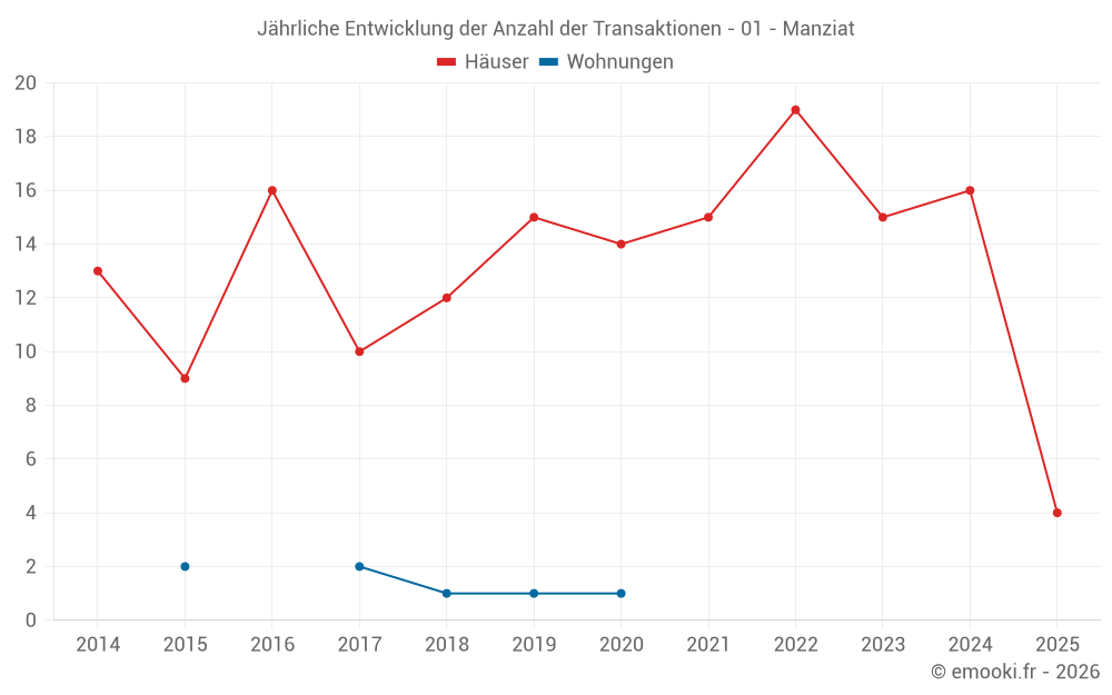 Der Durchschnittspreis auf den 30 Hausgeschäften der letzten 24 Monate in der Gemeinde Manziat betrug 2 337 € pro Quadratmeter für einen mittleren Immobilienwert von 230 000 €. Über diesen Zeitraum hinweg lagen 60% der Transaktionen zwischen 1 708 und 2 578 € pro Quadratmeter (vom 2. bis zum 8. Dezil).