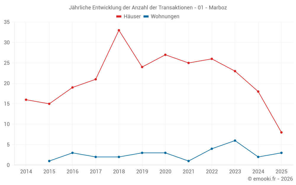 Der Durchschnittspreis auf den 18 Hausgeschäften der letzten 12 Monate in der Gemeinde Marboz betrug 2 066 € pro Quadratmeter für einen mittleren Immobilienwert von 221 000 €. Über diesen Zeitraum hinweg lagen 60% der Transaktionen zwischen 1 771 und 2 397 € pro Quadratmeter (vom 2. bis zum 8. Dezil).