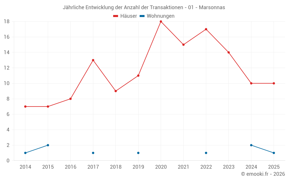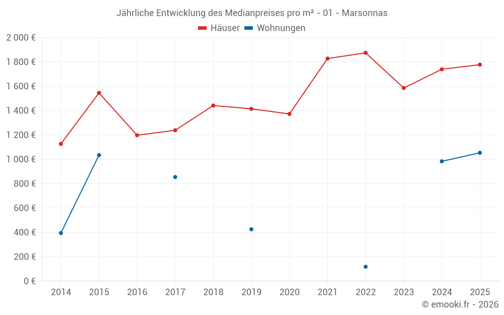 Der Durchschnittspreis auf den 17 Hausgeschäften der letzten 12 Monate in der Gemeinde Marsonnas betrug 1 747 € pro Quadratmeter für einen mittleren Immobilienwert von 190 000 €. Über diesen Zeitraum hinweg lagen 60% der Transaktionen zwischen 840 und 2 055 € pro Quadratmeter (vom 2. bis zum 8. Dezil).