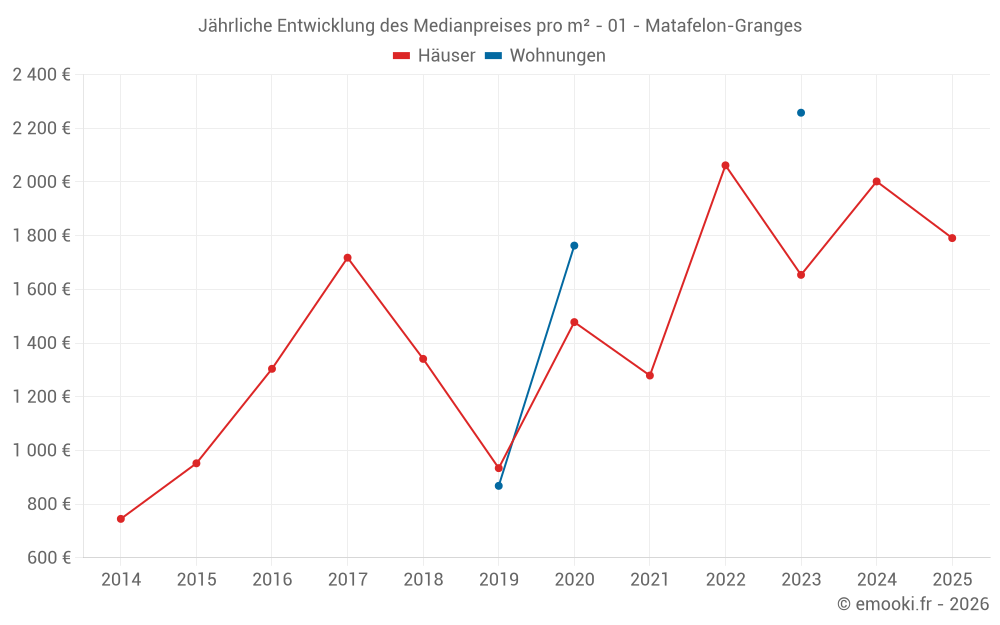 Der Durchschnittspreis auf den 30 Hausgeschäften der letzten 24 Monate in der Gemeinde Matafelon-Granges betrug 1 680 € pro Quadratmeter für einen mittleren Immobilienwert von 138 000 €. Über diesen Zeitraum hinweg lagen 60% der Transaktionen zwischen 1 076 und 2 523 € pro Quadratmeter (vom 2. bis zum 8. Dezil).