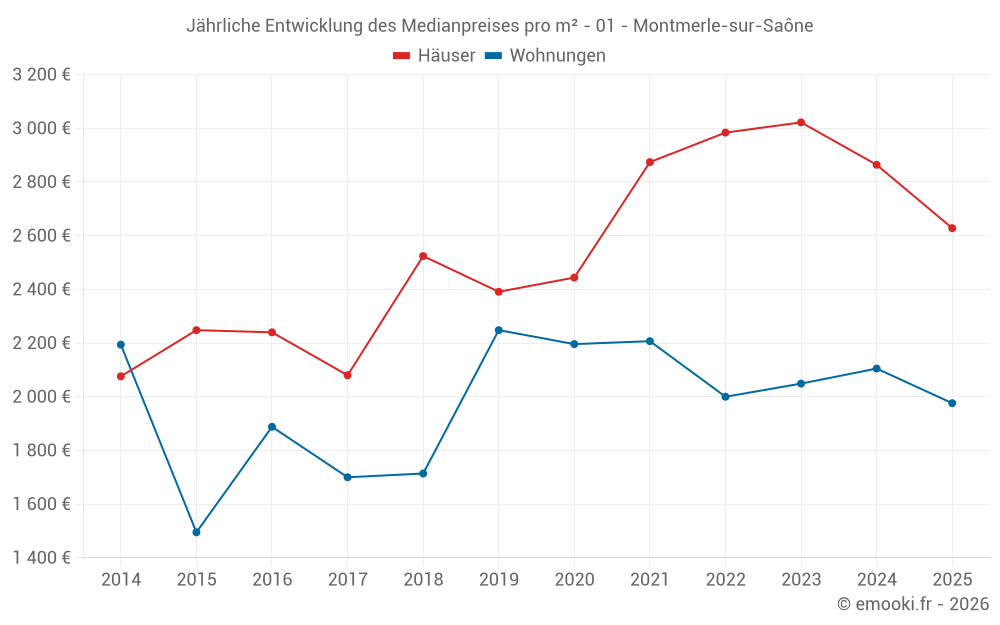 Der Durchschnittspreis auf den 30 Hausgeschäften der letzten 12 Monate in der Gemeinde Montmerle-sur-Saône betrug 2 754 € pro Quadratmeter für einen mittleren Immobilienwert von 277 500 €. Über diesen Zeitraum hinweg lagen 60% der Transaktionen zwischen 1 722 und 3 185 € pro Quadratmeter (vom 2. bis zum 8. Dezil).