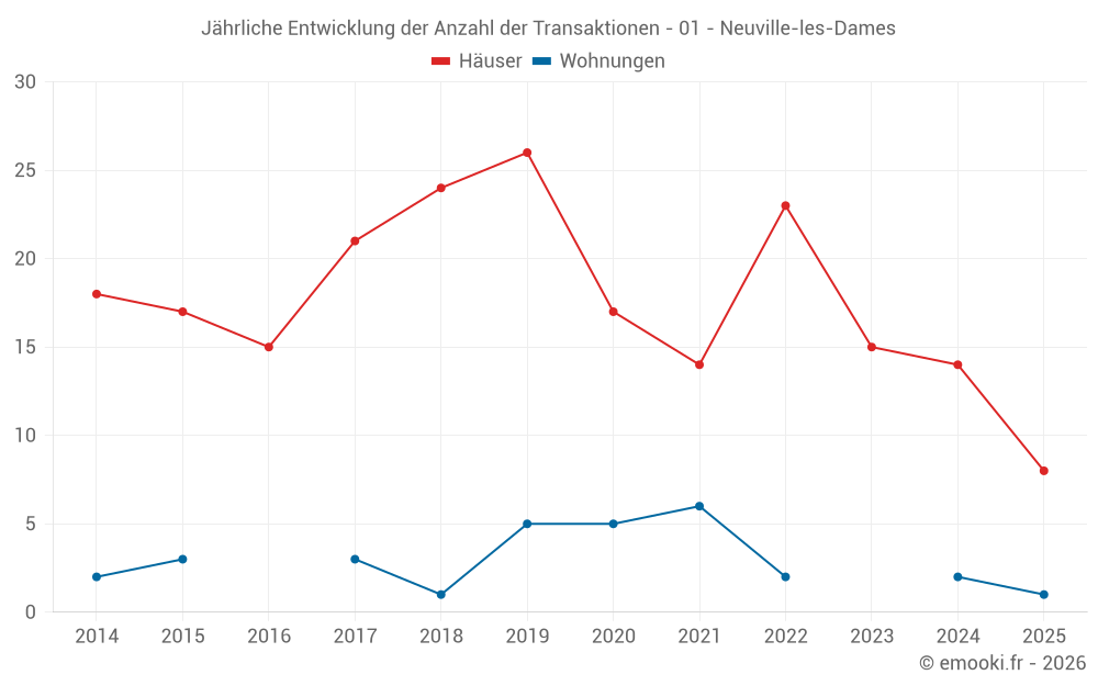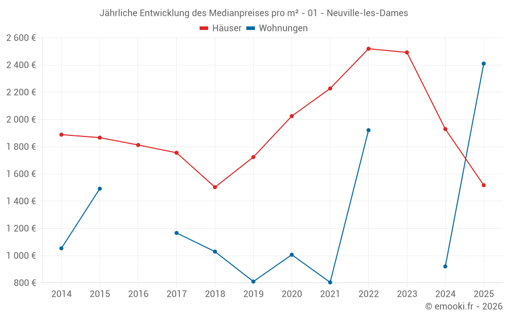 Der Durchschnittspreis auf den 31 Hausgeschäften der letzten 24 Monate in der Gemeinde Neuville-les-Dames betrug 1 813 € pro Quadratmeter für einen mittleren Immobilienwert von 212 900 €. Über diesen Zeitraum hinweg lagen 60% der Transaktionen zwischen 1 194 und 3 011 € pro Quadratmeter (vom 2. bis zum 8. Dezil).