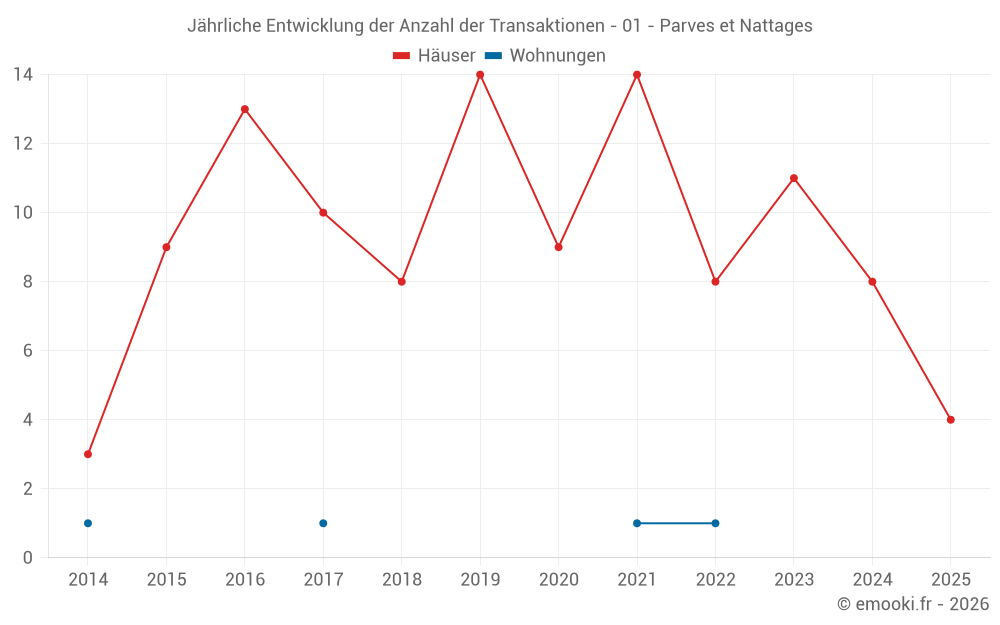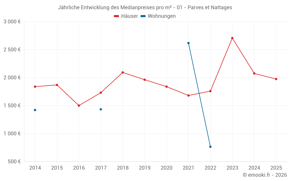 Der Durchschnittspreis auf den 18 Hausgeschäften der letzten 24 Monate in der Gemeinde Parves et Nattages betrug 2 451 € pro Quadratmeter für einen mittleren Immobilienwert von 315 865 €. Über diesen Zeitraum hinweg lagen 60% der Transaktionen zwischen 1 807 und 3 427 € pro Quadratmeter (vom 2. bis zum 8. Dezil).