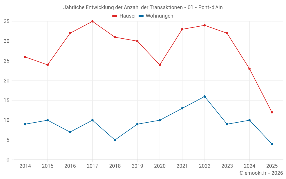 Der Durchschnittspreis auf den 24 Hausgeschäften der letzten 12 Monate in der Gemeinde Pont-d'Ain betrug 2 018 € pro Quadratmeter für einen mittleren Immobilienwert von 178 000 €. Über diesen Zeitraum hinweg lagen 60% der Transaktionen zwischen 972 und 2 557 € pro Quadratmeter (vom 2. bis zum 8. Dezil).