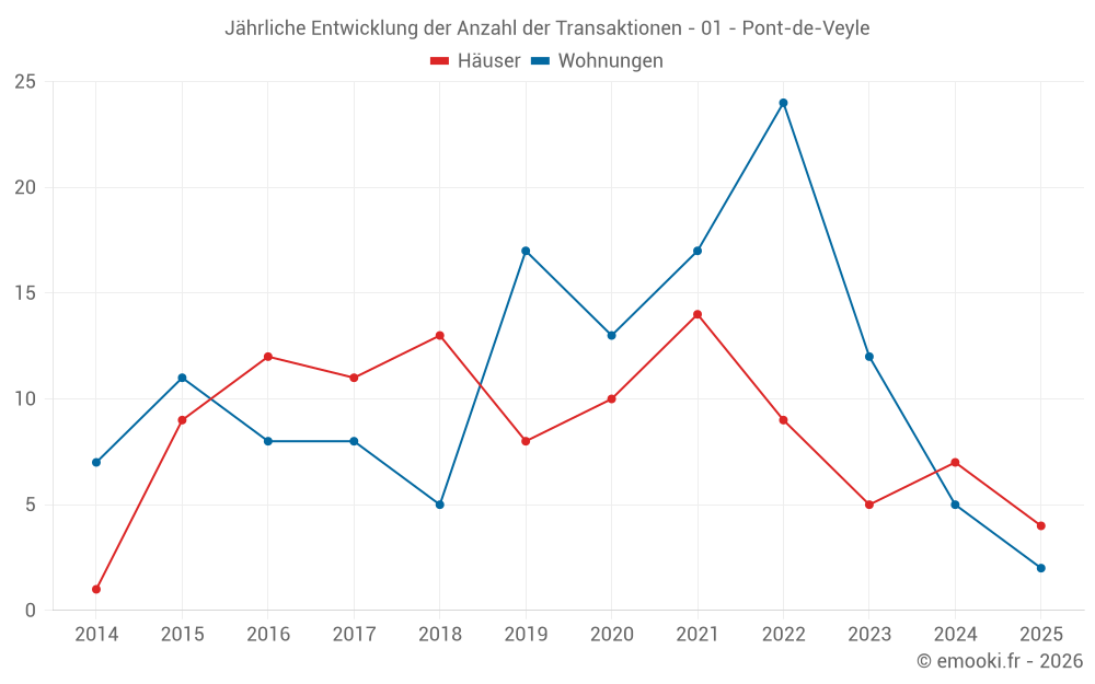 Der Durchschnittspreis auf den 14 Hausgeschäften der letzten 24 Monate in der Gemeinde Pont-de-Veyle betrug 2 317 € pro Quadratmeter für einen mittleren Immobilienwert von 232 500 €. Über diesen Zeitraum hinweg lagen 60% der Transaktionen zwischen 1 840 und 2 797 € pro Quadratmeter (vom 2. bis zum 8. Dezil).