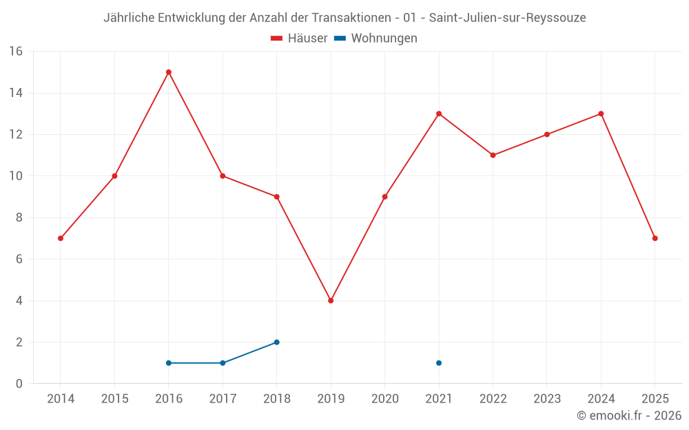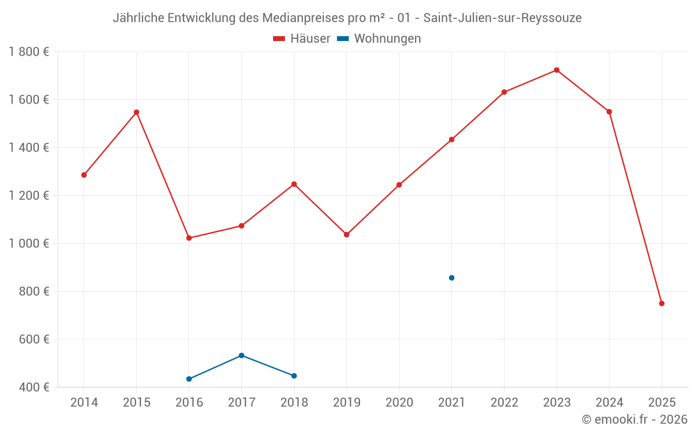 Der Durchschnittspreis auf den 17 Hausgeschäften der letzten 12 Monate in der Gemeinde Saint-Julien-sur-Reyssouze betrug 1 483 € pro Quadratmeter für einen mittleren Immobilienwert von 120 000 €. Über diesen Zeitraum hinweg lagen 60% der Transaktionen zwischen 686 und 2 086 € pro Quadratmeter (vom 2. bis zum 8. Dezil).