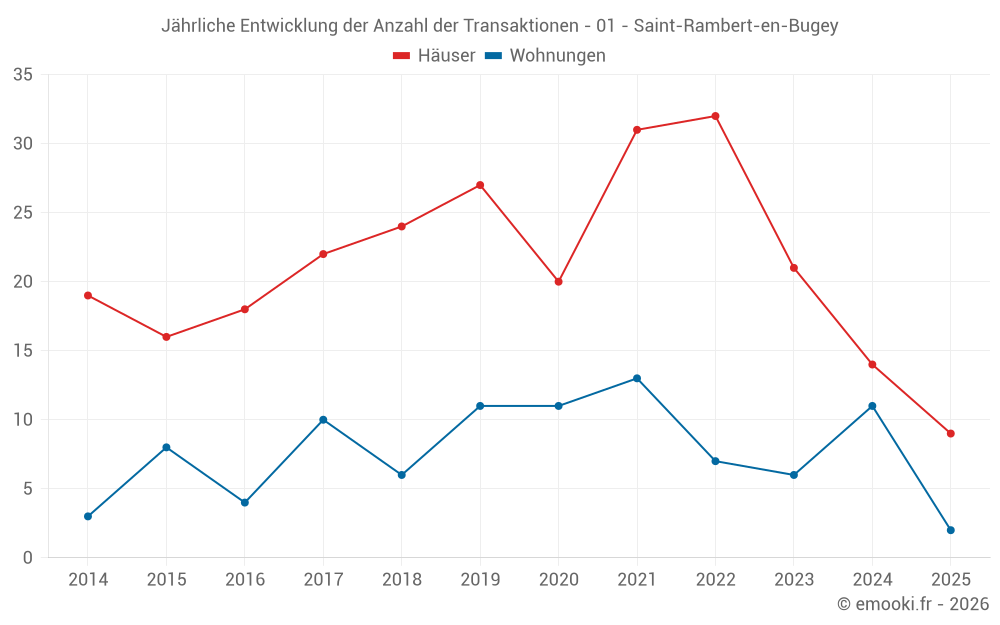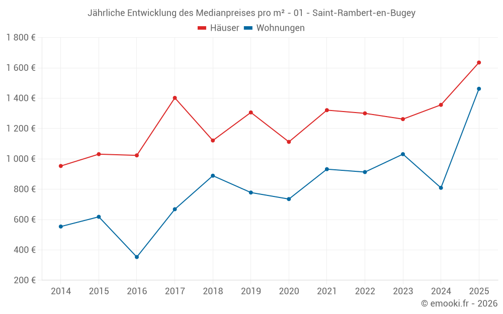 Der Durchschnittspreis auf den 17 Wohnungstransaktionen der letzten 24 Monate in der Gemeinde Saint-Rambert-en-Bugey betrug 989 € pro Quadratmeter für einen mittleren Immobilienwert von 60 000 €. Über diesen Zeitraum hinweg lagen 60% der Transaktionen zwischen 627 und 1 149 € pro Quadratmeter (vom 2. bis zum 8. Dezil).