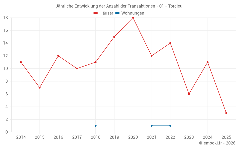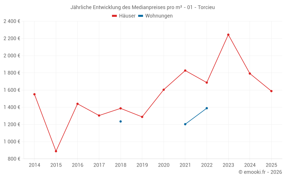 Der Durchschnittspreis auf den 18 Hausgeschäften der letzten 24 Monate in der Gemeinde Torcieu betrug 1 790 € pro Quadratmeter für einen mittleren Immobilienwert von 166 500 €. Über diesen Zeitraum hinweg lagen 60% der Transaktionen zwischen 1 427 und 2 138 € pro Quadratmeter (vom 2. bis zum 8. Dezil).