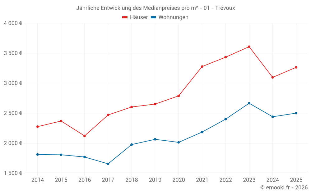Der Durchschnittspreis auf den 19 Wohnungstransaktionen der letzten 6 Monate in der Gemeinde Trévoux betrug 2 500 € pro Quadratmeter für einen mittleren Immobilienwert von 141 000 €. Über diesen Zeitraum hinweg lagen 60% der Transaktionen zwischen 1 563 und 3 397 € pro Quadratmeter (vom 2. bis zum 8. Dezil).