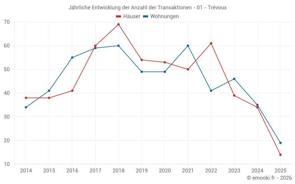 Der Durchschnittspreis auf den 35 Hausgeschäften der letzten 12 Monate in der Gemeinde Trévoux betrug 3 221 € pro Quadratmeter für einen mittleren Immobilienwert von 320 000 €. Über diesen Zeitraum hinweg lagen 60% der Transaktionen zwischen 2 479 und 3 794 € pro Quadratmeter (vom 2. bis zum 8. Dezil).