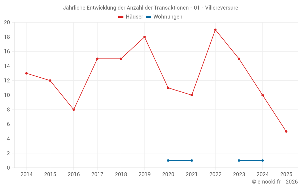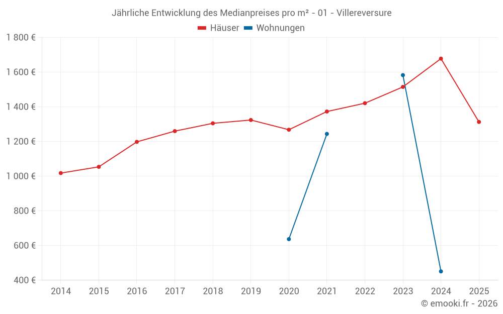 Der Durchschnittspreis auf den 22 Hausgeschäften der letzten 24 Monate in der Gemeinde Villereversure betrug 1 562 € pro Quadratmeter für einen mittleren Immobilienwert von 149 500 €. Über diesen Zeitraum hinweg lagen 60% der Transaktionen zwischen 1 144 und 2 155 € pro Quadratmeter (vom 2. bis zum 8. Dezil).