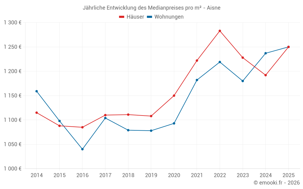 Der Durchschnittspreis auf den 1389 Hausgeschäften der letzten 3 Monate im Aisne-Departement betrug 1 224 € pro Quadratmeter für einen mittleren Immobilienwert von 117 000 €. Über diesen Zeitraum hinweg lagen 60% der Transaktionen zwischen 743 und 1 766 € pro Quadratmeter (vom 2. bis zum 8. Dezil).