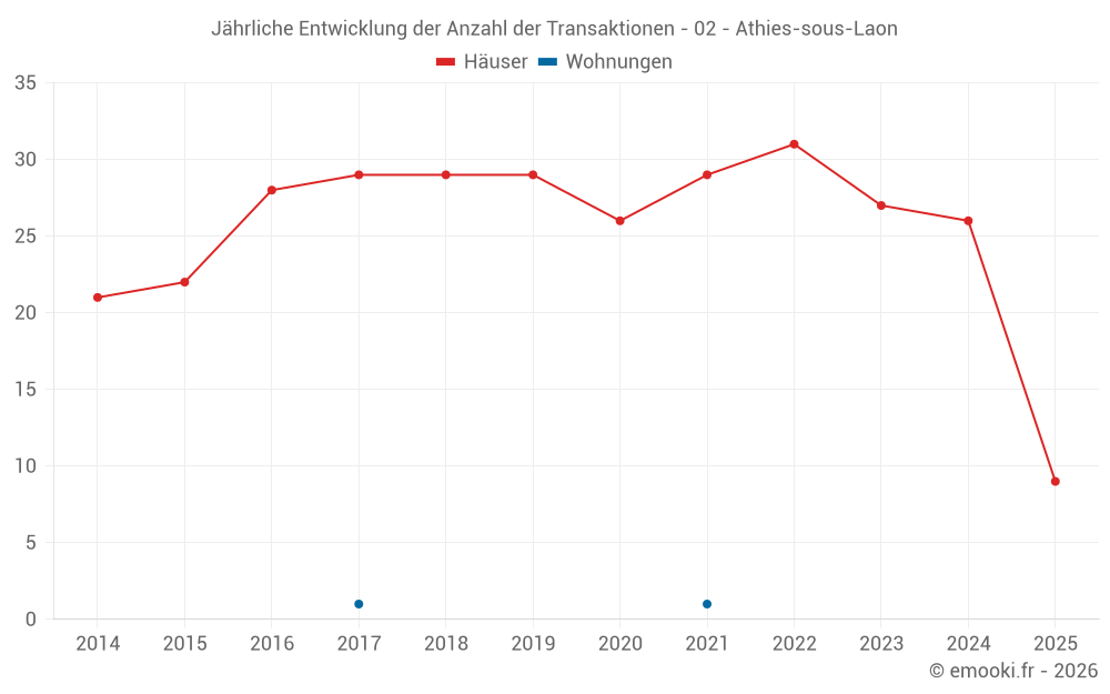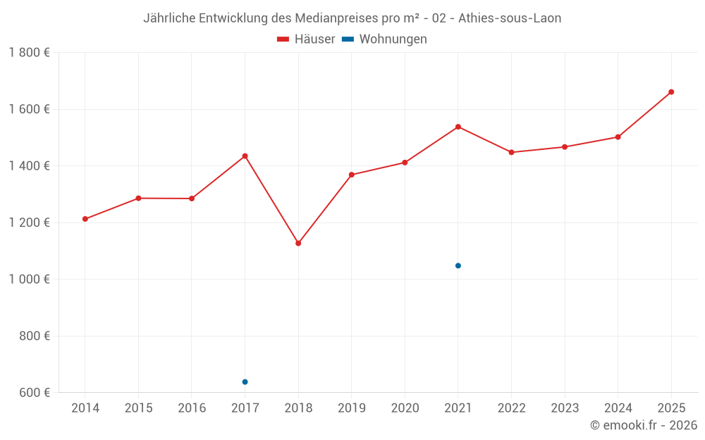 Der Durchschnittspreis auf den 22 Hausgeschäften der letzten 12 Monate in der Gemeinde Athies-sous-Laon betrug 1 392 € pro Quadratmeter für einen mittleren Immobilienwert von 130 225 €. Über diesen Zeitraum hinweg lagen 60% der Transaktionen zwischen 1 102 und 1 799 € pro Quadratmeter (vom 2. bis zum 8. Dezil).