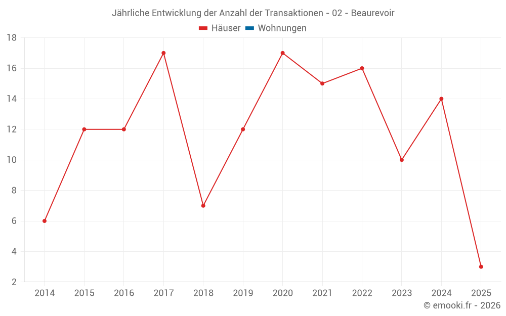 Der Durchschnittspreis auf den 19 Hausgeschäften der letzten 24 Monate in der Gemeinde Beaurevoir betrug 833 € pro Quadratmeter für einen mittleren Immobilienwert von 72 000 €. Über diesen Zeitraum hinweg lagen 60% der Transaktionen zwischen 532 und 1 028 € pro Quadratmeter (vom 2. bis zum 8. Dezil).
