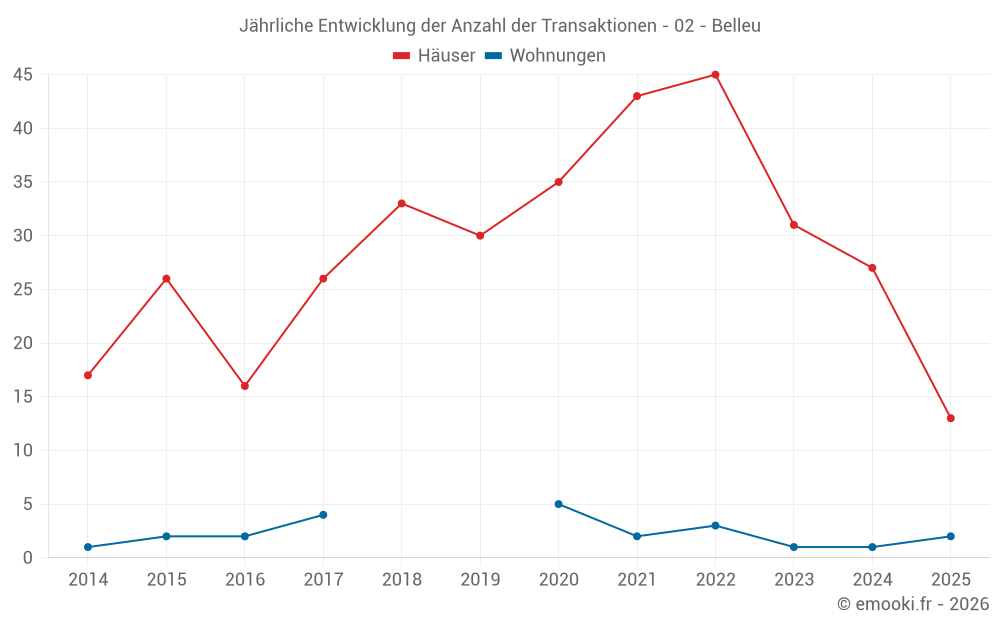 Der Durchschnittspreis auf den 26 Hausgeschäften der letzten 12 Monate in der Gemeinde Belleu betrug 1 632 € pro Quadratmeter für einen mittleren Immobilienwert von 133 175 €. Über diesen Zeitraum hinweg lagen 60% der Transaktionen zwischen 1 238 und 1 935 € pro Quadratmeter (vom 2. bis zum 8. Dezil).
