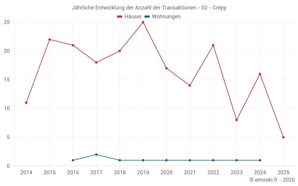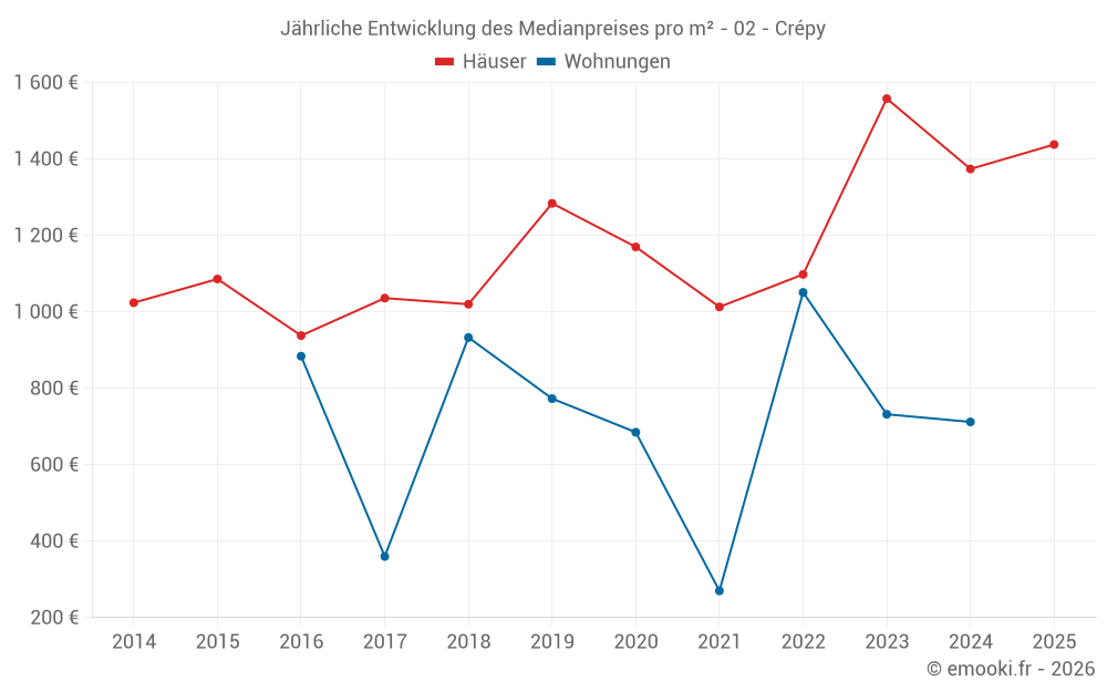 Der Durchschnittspreis auf den 27 Hausgeschäften der letzten 24 Monate in der Gemeinde Crépy betrug 1 406 € pro Quadratmeter für einen mittleren Immobilienwert von 126 000 €. Über diesen Zeitraum hinweg lagen 60% der Transaktionen zwischen 1 148 und 1 944 € pro Quadratmeter (vom 2. bis zum 8. Dezil).