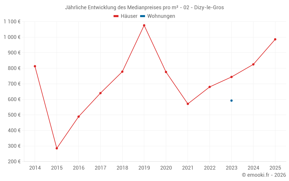 Der Durchschnittspreis auf den 21 Hausgeschäften der letzten 24 Monate in der Gemeinde Dizy-le-Gros betrug 825 € pro Quadratmeter für einen mittleren Immobilienwert von 71 000 €. Über diesen Zeitraum hinweg lagen 60% der Transaktionen zwischen 488 und 1 053 € pro Quadratmeter (vom 2. bis zum 8. Dezil).