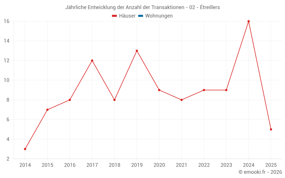 Der Durchschnittspreis auf den 16 Hausgeschäften der letzten 12 Monate in der Gemeinde Étreillers betrug 1 087 € pro Quadratmeter für einen mittleren Immobilienwert von 107 625 €. Über diesen Zeitraum hinweg lagen 60% der Transaktionen zwischen 814 und 1 514 € pro Quadratmeter (vom 2. bis zum 8. Dezil).
