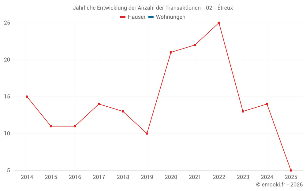 Der Durchschnittspreis auf den 24 Hausgeschäften der letzten 24 Monate in der Gemeinde Étreux betrug 812 € pro Quadratmeter für einen mittleren Immobilienwert von 70 000 €. Über diesen Zeitraum hinweg lagen 60% der Transaktionen zwischen 644 und 1 107 € pro Quadratmeter (vom 2. bis zum 8. Dezil).