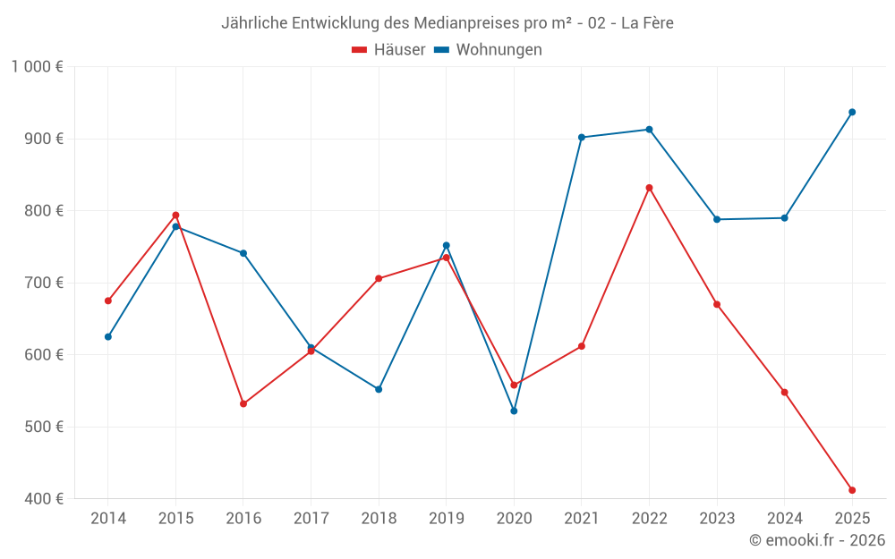 Der Durchschnittspreis auf den 17 Wohnungstransaktionen der letzten 24 Monate in der Gemeinde La Fère betrug 904 € pro Quadratmeter für einen mittleren Immobilienwert von 88 500 €. Über diesen Zeitraum hinweg lagen 60% der Transaktionen zwischen 736 und 1 294 € pro Quadratmeter (vom 2. bis zum 8. Dezil).