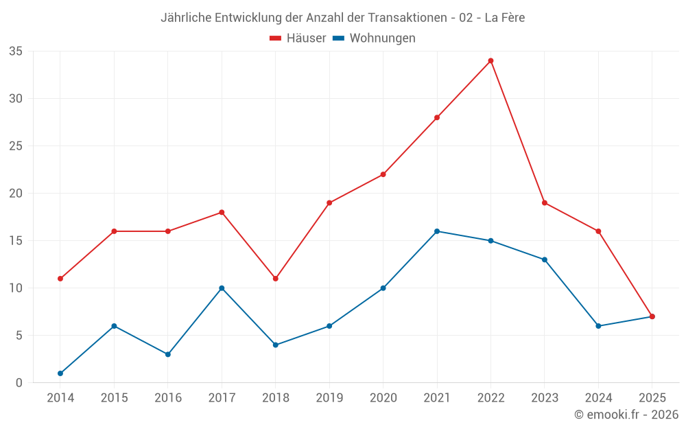 Der Durchschnittspreis auf den 16 Hausgeschäften der letzten 12 Monate in der Gemeinde La Fère betrug 475 € pro Quadratmeter für einen mittleren Immobilienwert von 79 200 €. Über diesen Zeitraum hinweg lagen 60% der Transaktionen zwischen 368 und 1 268 € pro Quadratmeter (vom 2. bis zum 8. Dezil).