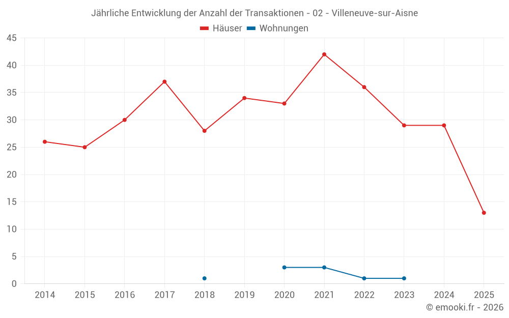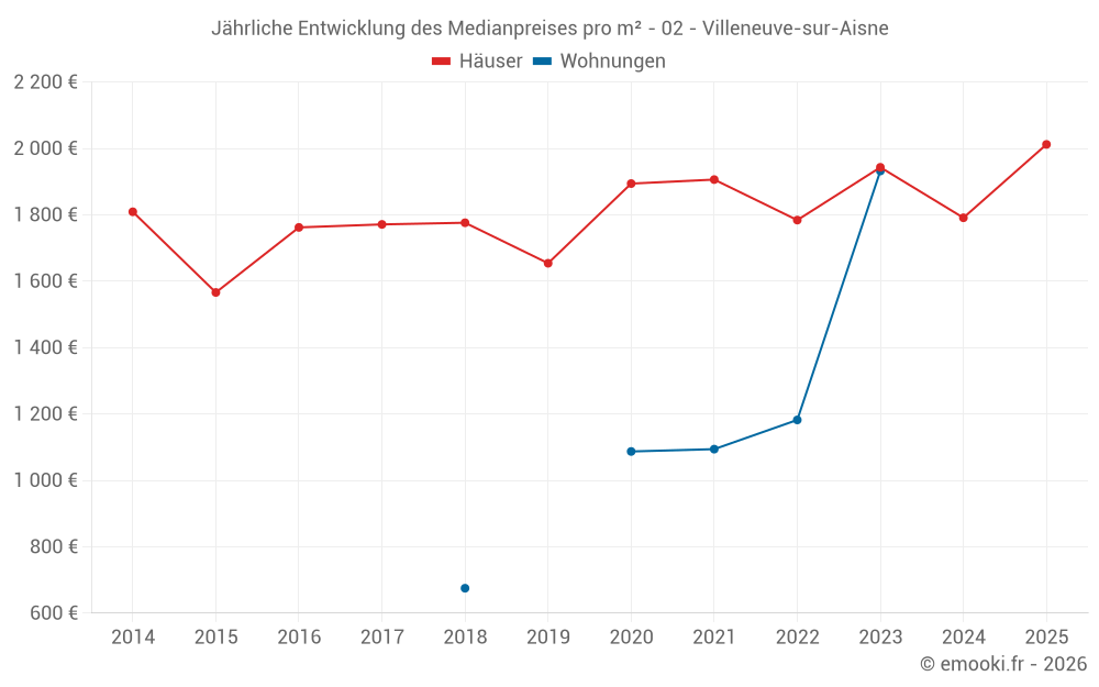 Der Durchschnittspreis auf den 31 Hausgeschäften der letzten 12 Monate in der Gemeinde Villeneuve-sur-Aisne betrug 1 845 € pro Quadratmeter für einen mittleren Immobilienwert von 180 000 €. Über diesen Zeitraum hinweg lagen 60% der Transaktionen zwischen 1 505 und 2 094 € pro Quadratmeter (vom 2. bis zum 8. Dezil).