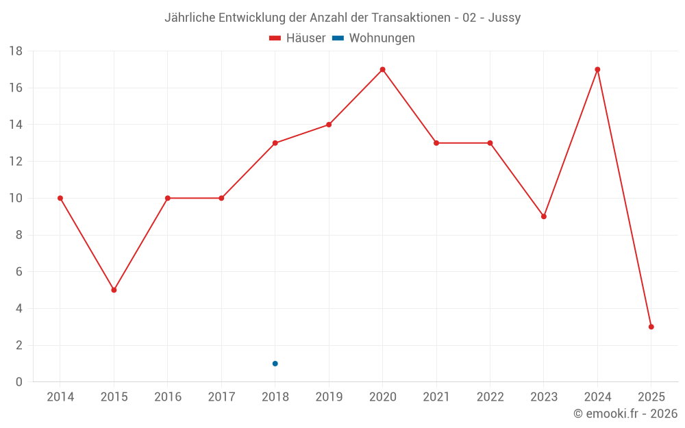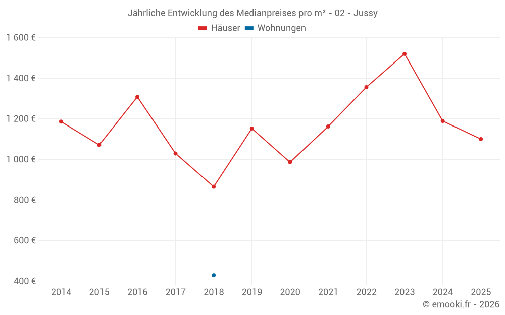 Der Durchschnittspreis auf den 25 Hausgeschäften der letzten 24 Monate in der Gemeinde Jussy betrug 1 189 € pro Quadratmeter für einen mittleren Immobilienwert von 108 000 €. Über diesen Zeitraum hinweg lagen 60% der Transaktionen zwischen 547 und 1 531 € pro Quadratmeter (vom 2. bis zum 8. Dezil).